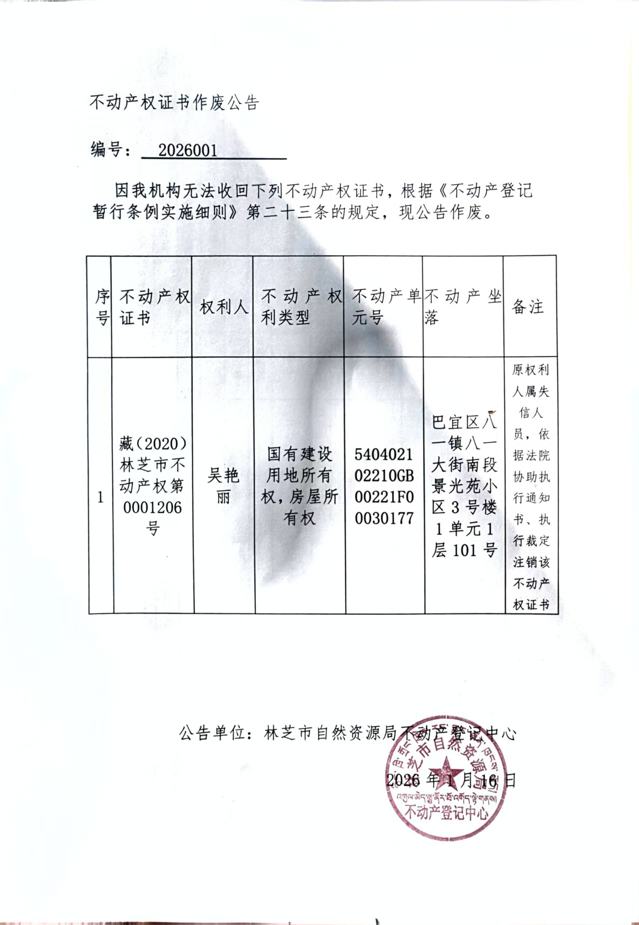 藏(2020)林芝市不动产权第0001206号不动产权证书作废公告