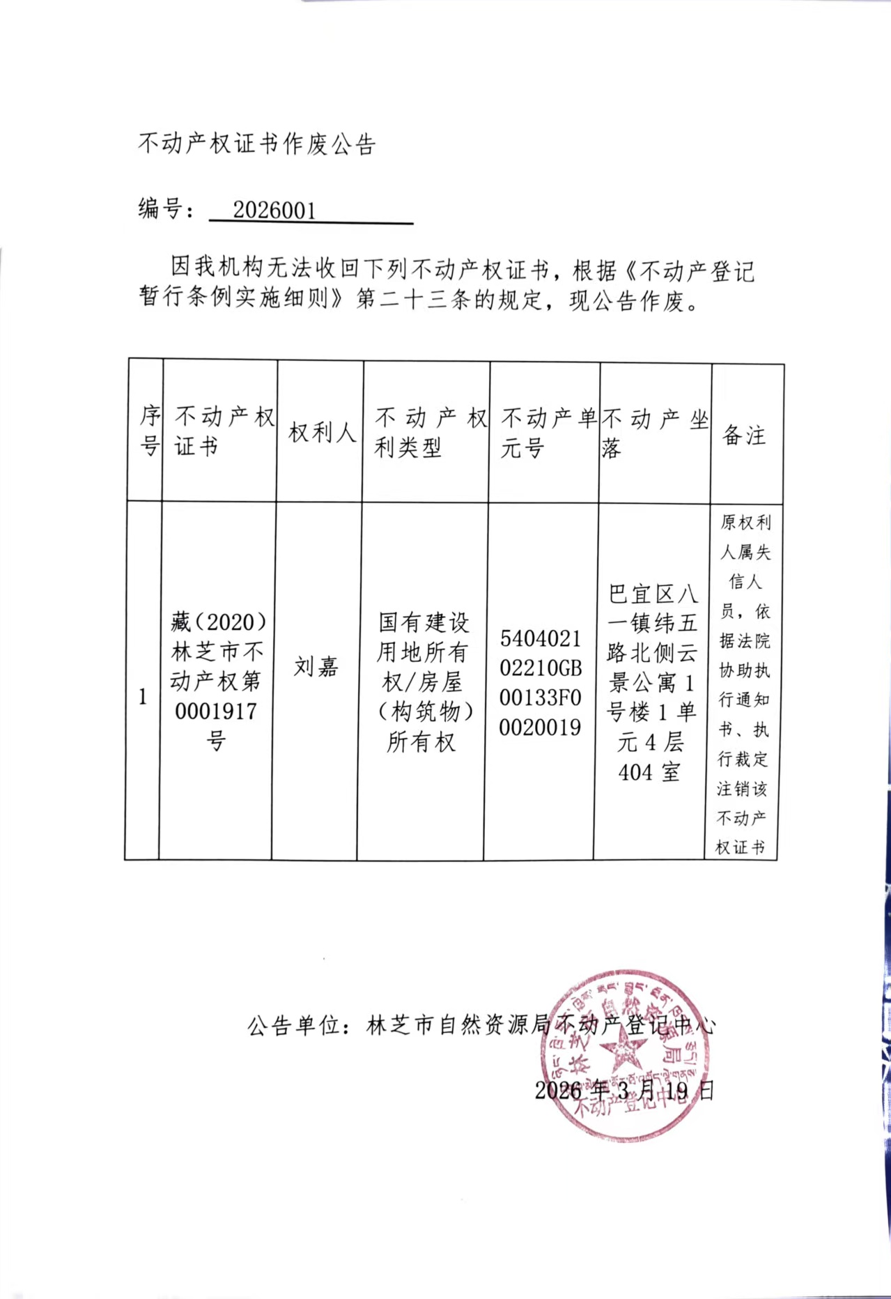 藏(2020)林芝市不动产权第0001917号不动产权证书作废公告